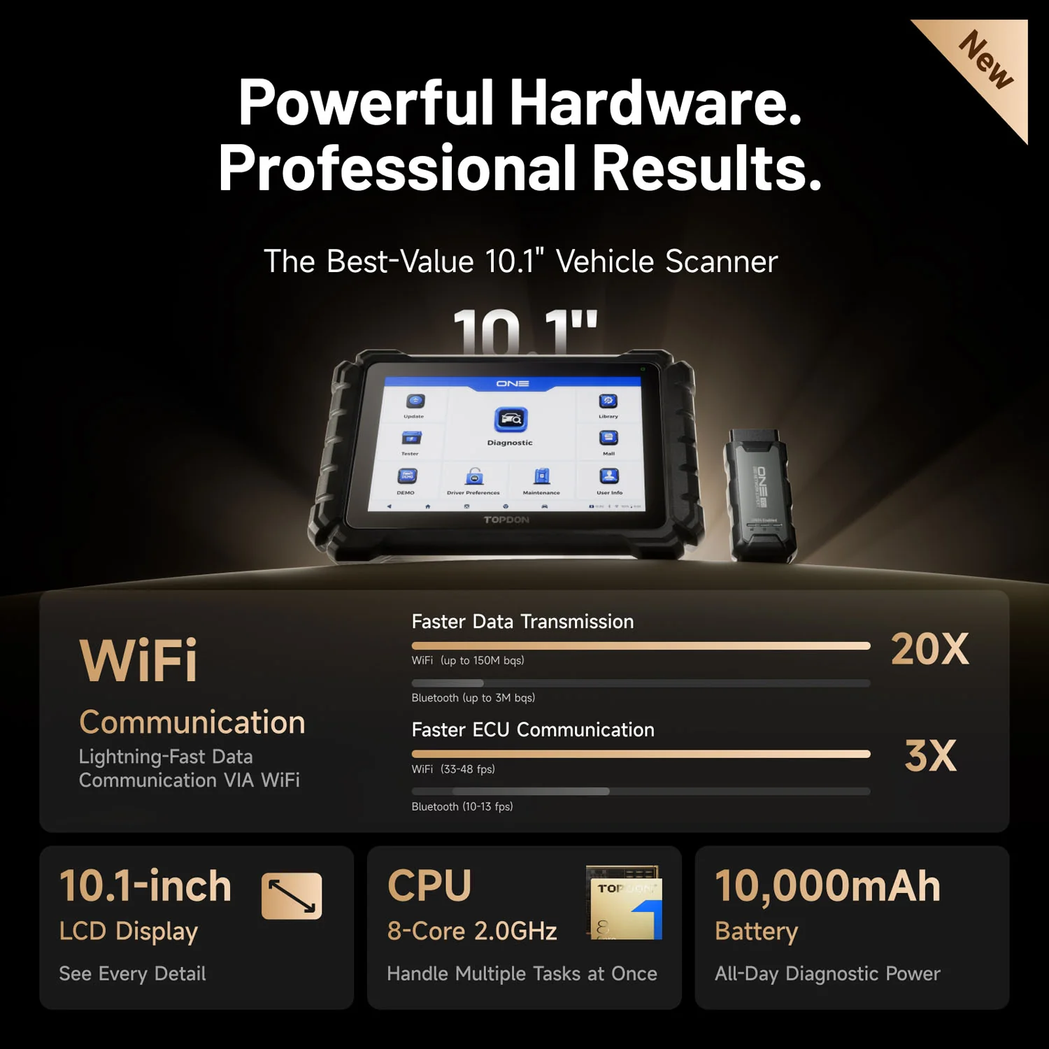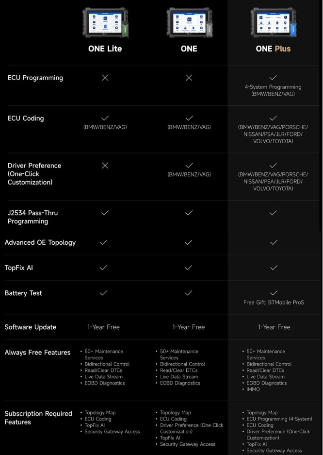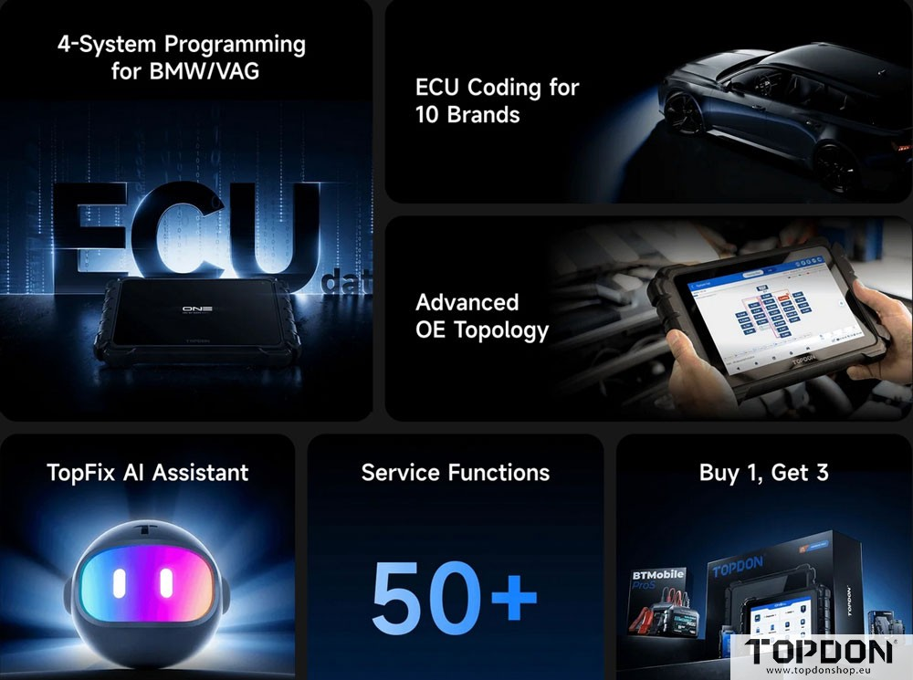 Izrađen za profesionalne servisne radionice i dijagnostičke stručnjake, TOPDON ONE Plus pruža istinske performanse na razini originalne opreme. Od naprednog programiranja i kodiranja ECU-a do više od 50 bitnih servisnih funkcija, tehničarima pruža kontrolu, brzinu i pristup koji današnja vozila zahtijevaju.