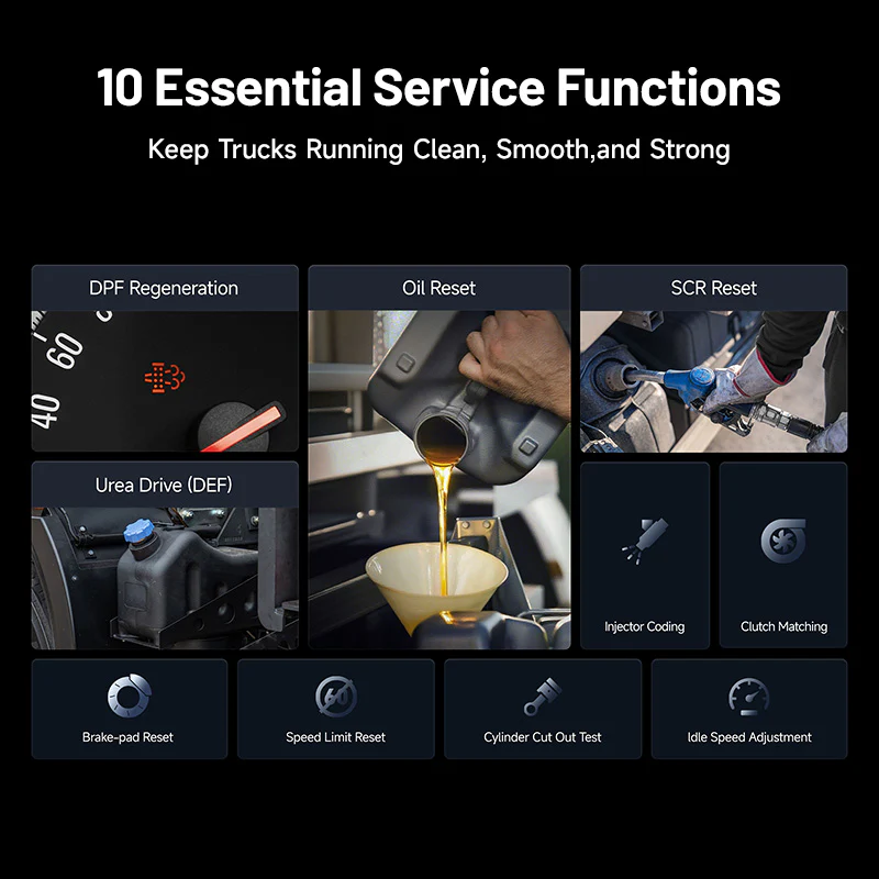 Opremljen s 10 bitnih servisnih funkcija, uključujući regeneraciju DPF-a, resetiranje ulja, resetiranje SCR-a, kodiranje injektora i Urea Drive (DEF), ArtiDiag HD je napravljen za rješavanje najčešćih potreba održavanja teških kamiona. Pomaže u održavanju ispravnog rada sustava emisija, smanjuje vrijeme zastoja zbog popravka i produžuje vijek trajanja kritičnih komponenti.
