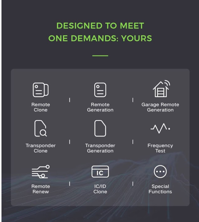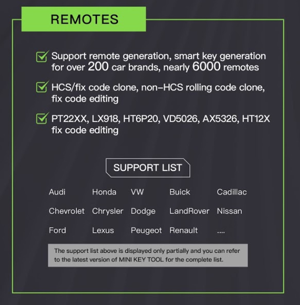 Podržava kloniranje HCS/fiksnog koda, podržava kloniranje promjenjivog koda koji nije HCS, podržava uređivanje fiksnog koda za PT22XX, LX918, HT6P20, VD5026, AX5326, HT12X.
