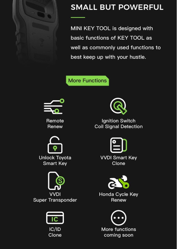 Xhorse VVDI mini alat za ključeve dolazi kao zamjena za VVDI alat za ključeve. Odlikuje se veličinom, težinom, velikom brzinom i kompatibilnošću s mobilnim uređajima. Dobro radi za kloniranje čipova i daljinsko kopiranje i generiranje ključeva. VVDI mini alat za ključeve je višejezičan, a promjena jezika je besplatna. Imajte na umu da ovo nije ID48 96-bitna funkcija i nema jednodnevnu besplatnu verziju tokena.